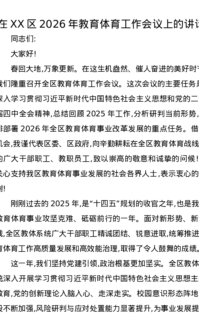 在XX区2026年教育体育工作会议上的讲话