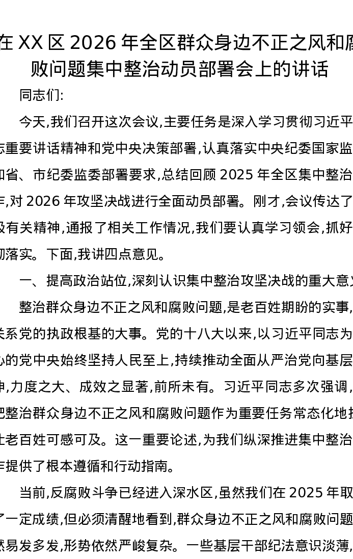 在XX区2026年全区群众身边不正之风和腐败问题集中整治动员部署会上的讲话