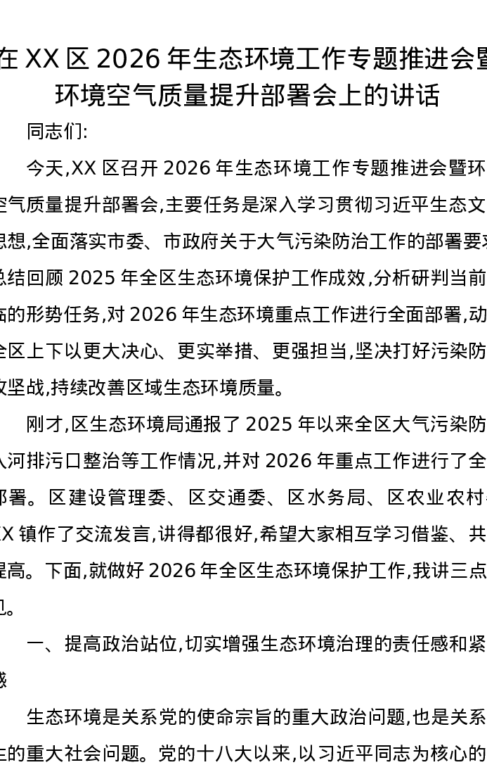 在XX区2026年生态环境工作专题推进会暨环境空气质量提升部署会上的讲话