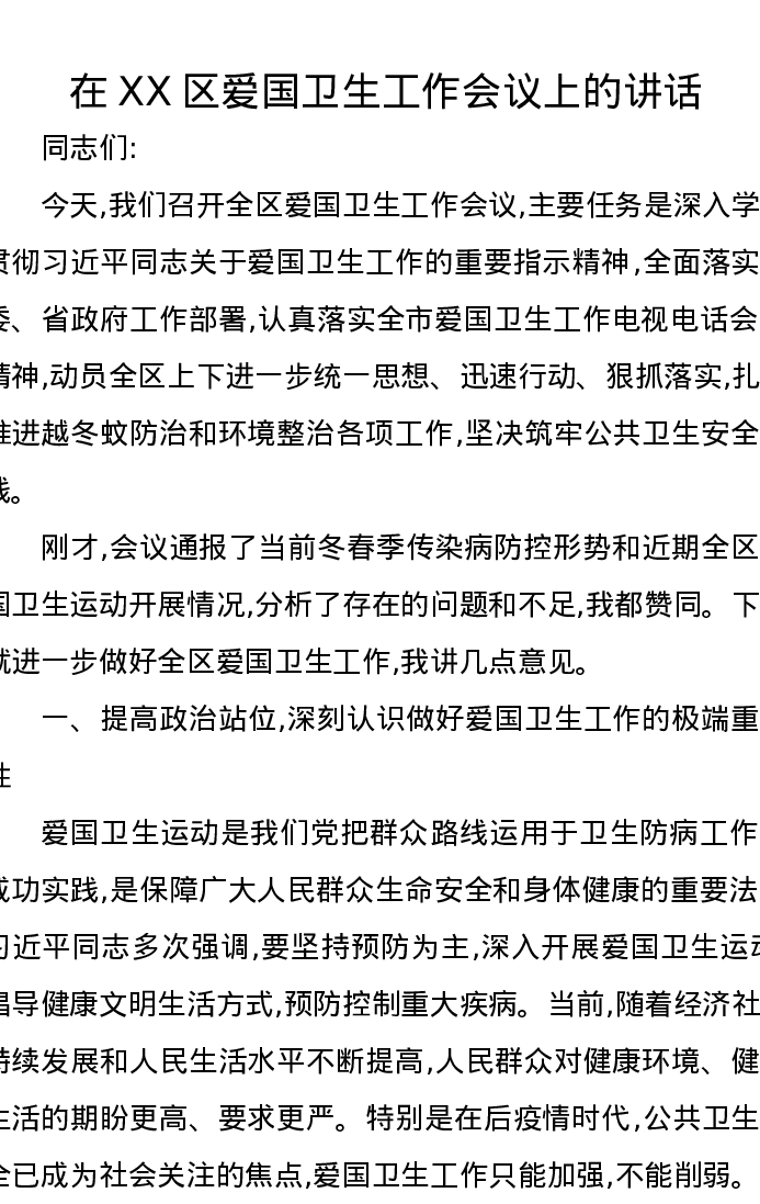 在XX区爱国卫生工作会议上的讲话