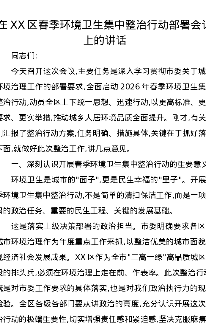 在XX区春季环境卫生集中整治行动部署会议上的讲话