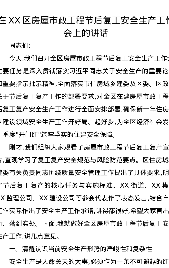 在XX区房屋市政工程节后复工安全生产工作会上的讲话