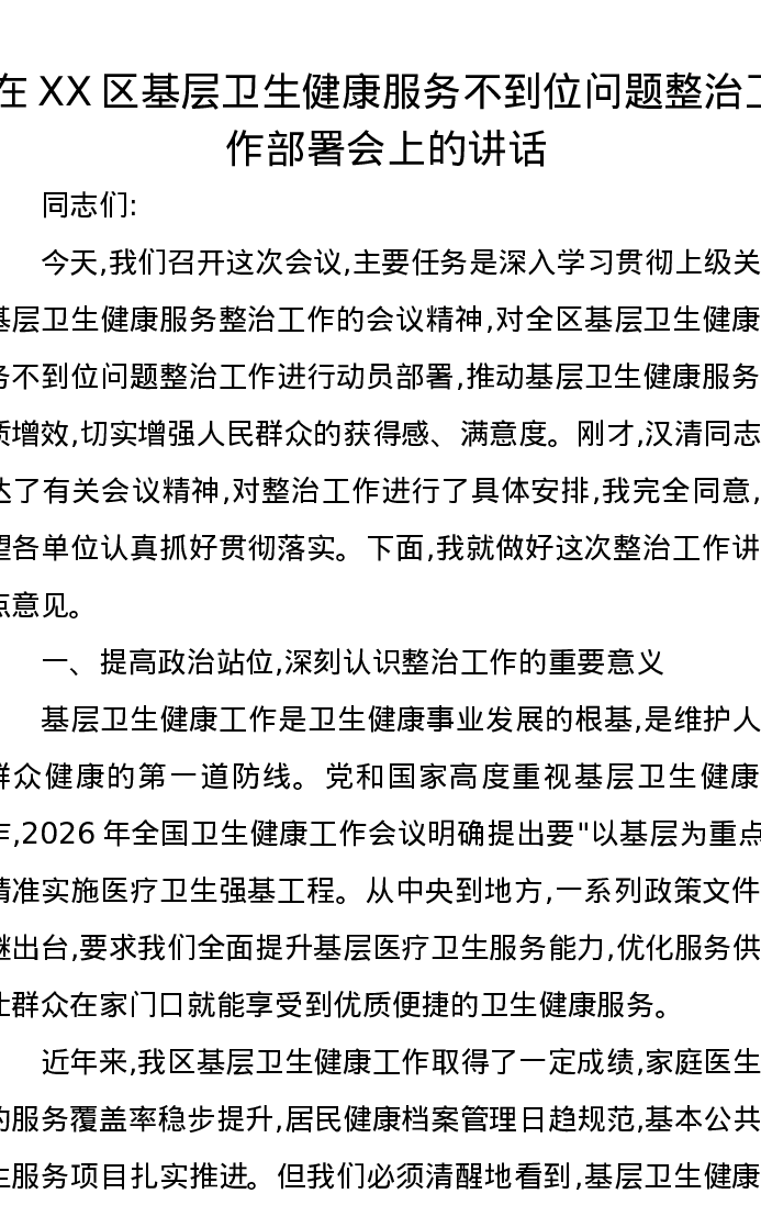 在XX区基层卫生健康服务不到位问题整治工作部署会上的讲话