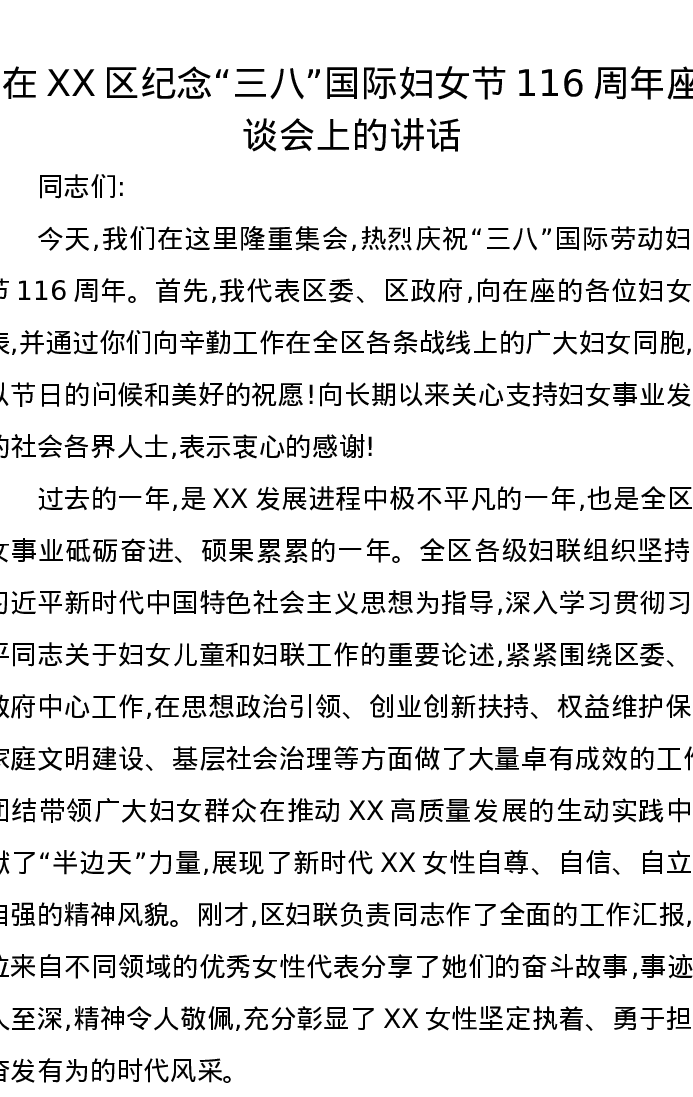 在XX区纪念三八国际妇女节116周年座谈会上的讲话