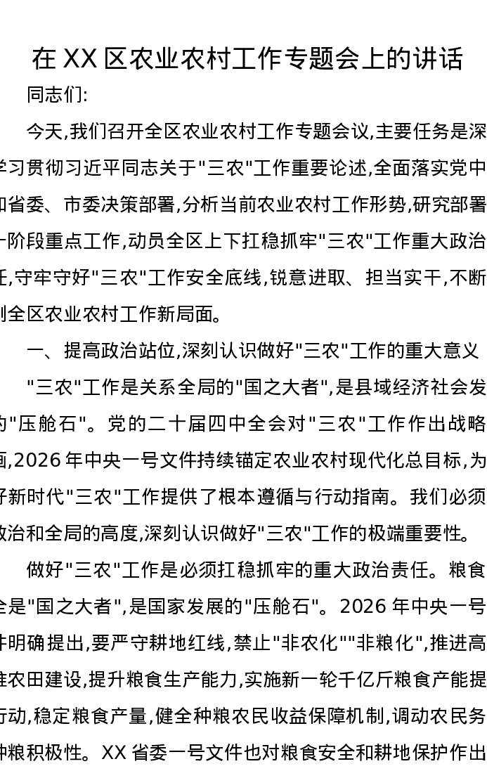 在XX区农业农村工作专题会上的讲话