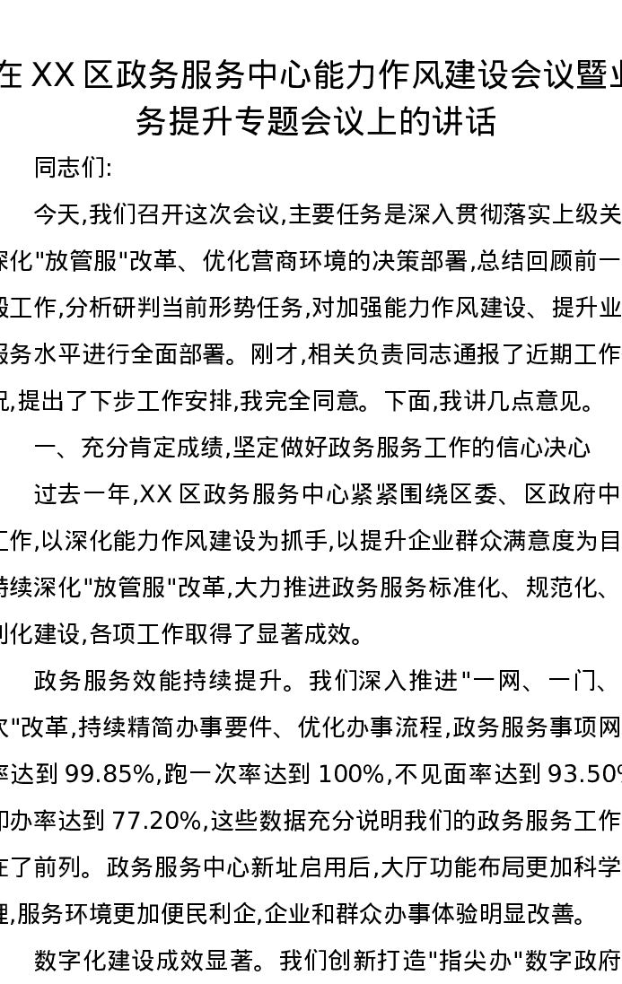 在XX区政务服务中心能力作风建设会议暨业务提升专题会议上的讲话