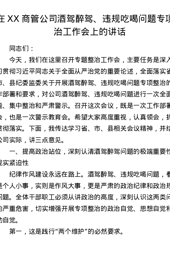 在XX商管公司酒驾醉驾、违规吃喝问题专项整治工作会上的讲话