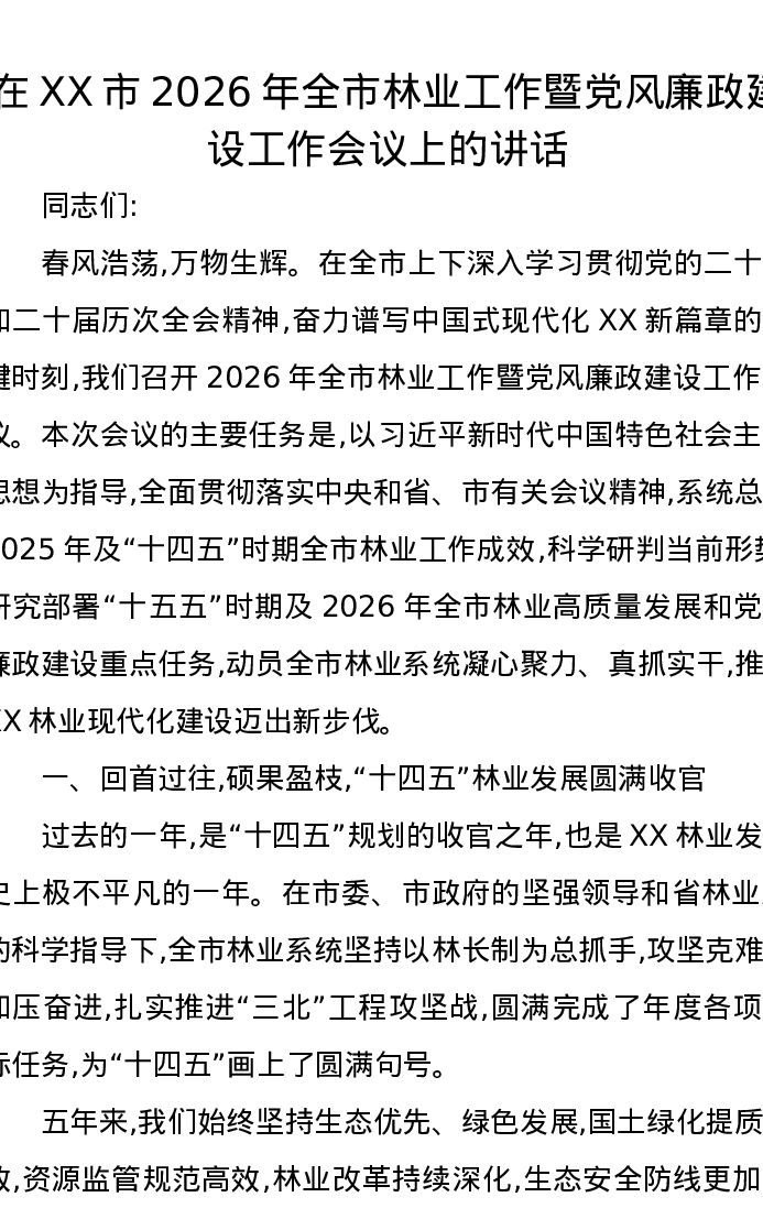 在XX市2026年全市林业工作暨党风廉政建设工作会议上的讲话