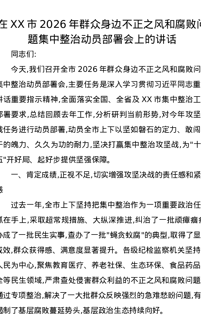 在XX市2026年群众身边不正之风和腐败问题集中整治动员部署会上的讲话