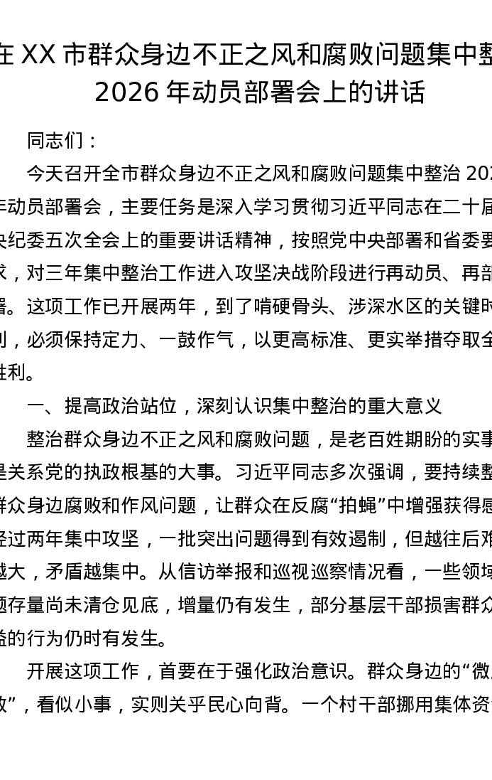 在XX市群众身边不正之风和腐败问题集中整治2026年动员部署会上的讲话2