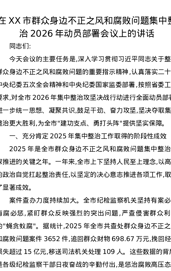 在XX市群众身边不正之风和腐败问题集中整治2026年动员部署会议上的讲话