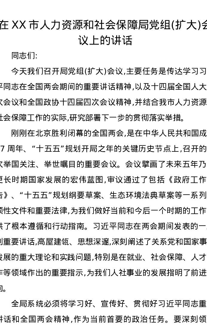 在XX市人力资源和社会保障局党组(扩大)会议上的讲话