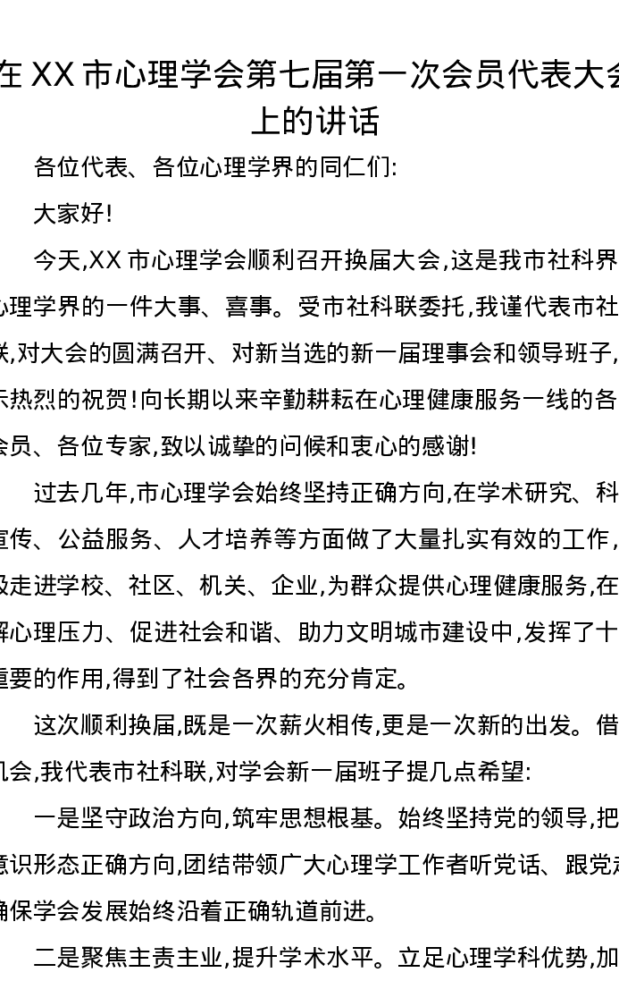 在XX市心理学会第七届第一次会员代表大会上的讲话