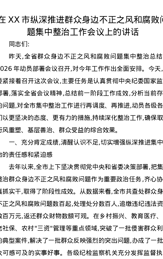 在XX市纵深推进群众身边不正之风和腐败问题集中整治工作会议上的讲话