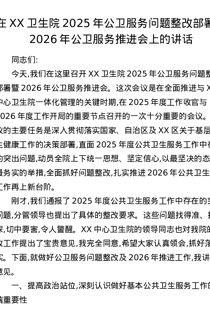 在XX卫生院2025年公卫服务问题整改部署暨2026年公卫服务推进会上的讲话