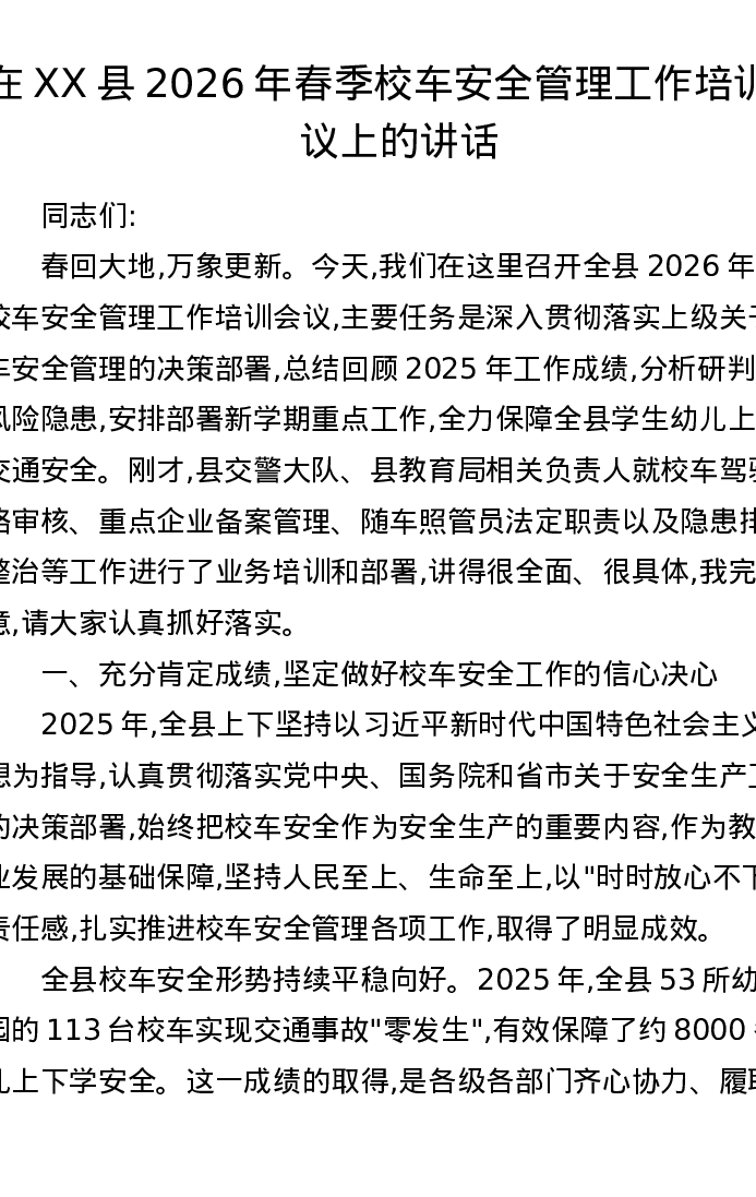 在XX县2026年春季校车安全管理工作培训会议上的讲话