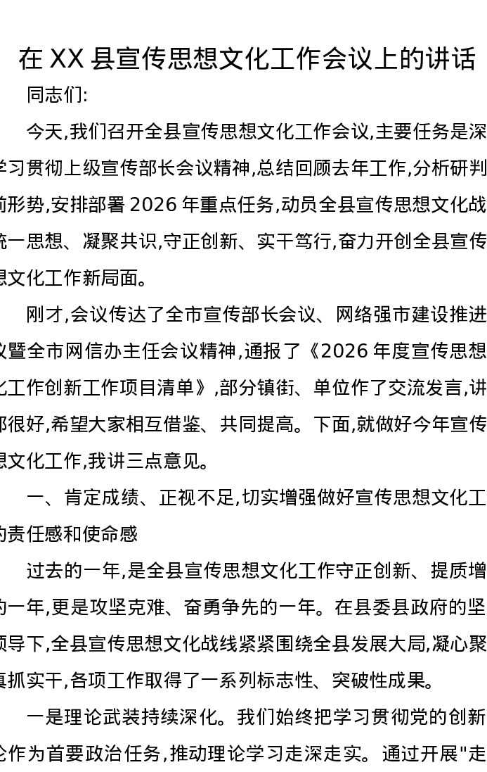 在XX县宣传思想文化工作会议上的讲话2