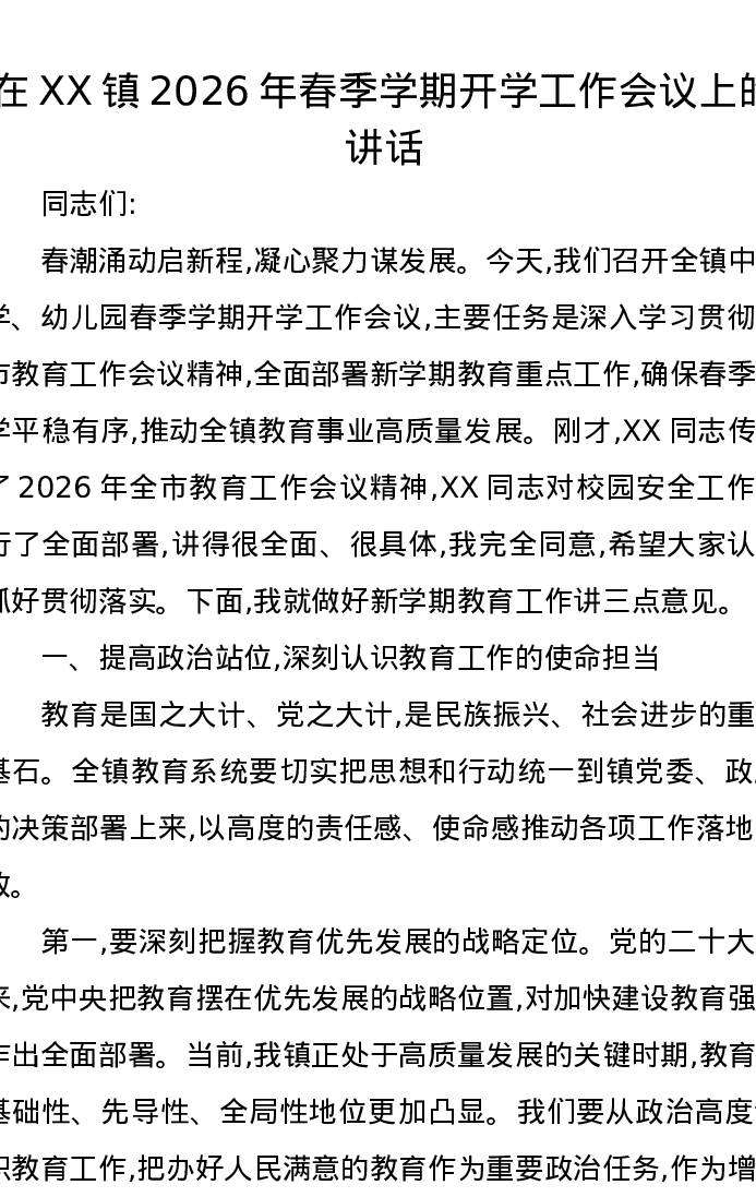 在XX镇2026年春季学期开学工作会议上的讲话