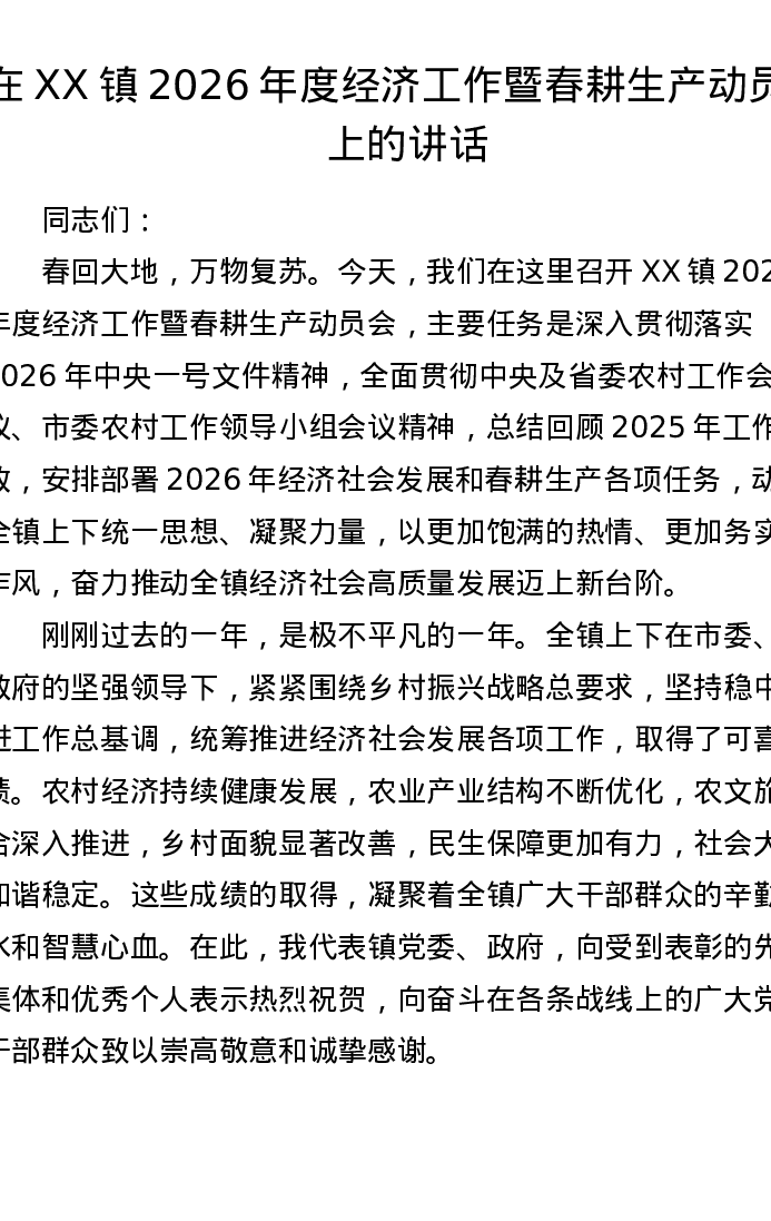 在XX镇2026年度经济工作暨春耕生产动员会上的讲话