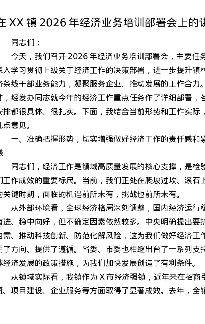 在XX镇2026年经济业务培训部署会上的讲话