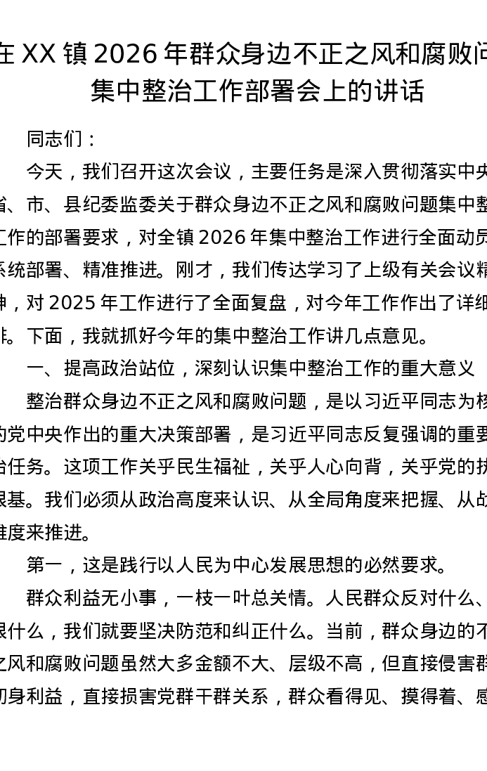 在XX镇2026年群众身边不正之风和腐败问题集中整治工作部署会上的讲话