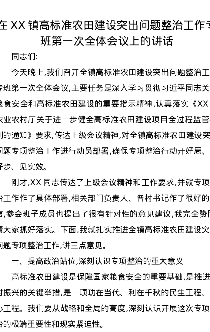 在XX镇高标准农田建设突出问题整治工作专班第一次全体会议上的讲话