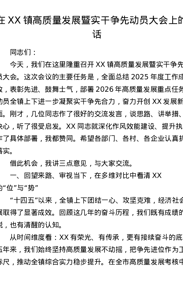 在XX镇高质量发展暨实干争先动员大会上的讲话