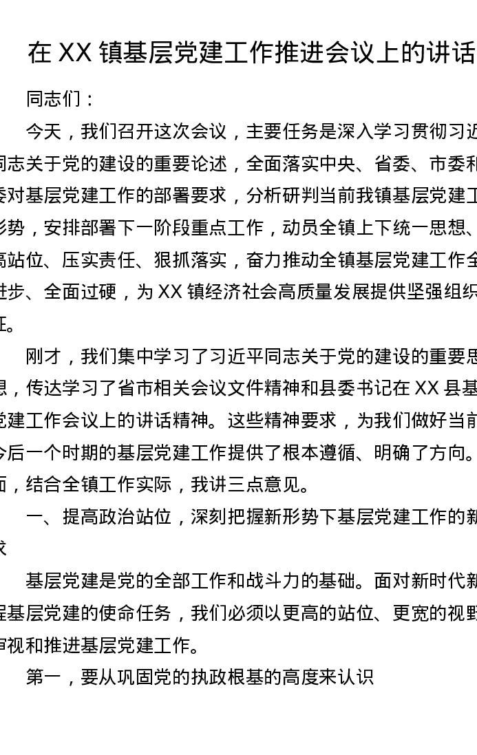 在XX镇基层党建工作推进会议上的讲话