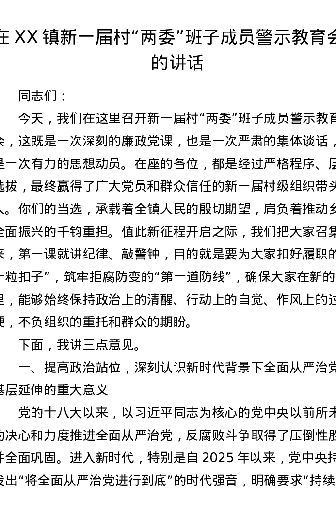 在XX镇新一届村两委班子成员警示教育会上的讲话