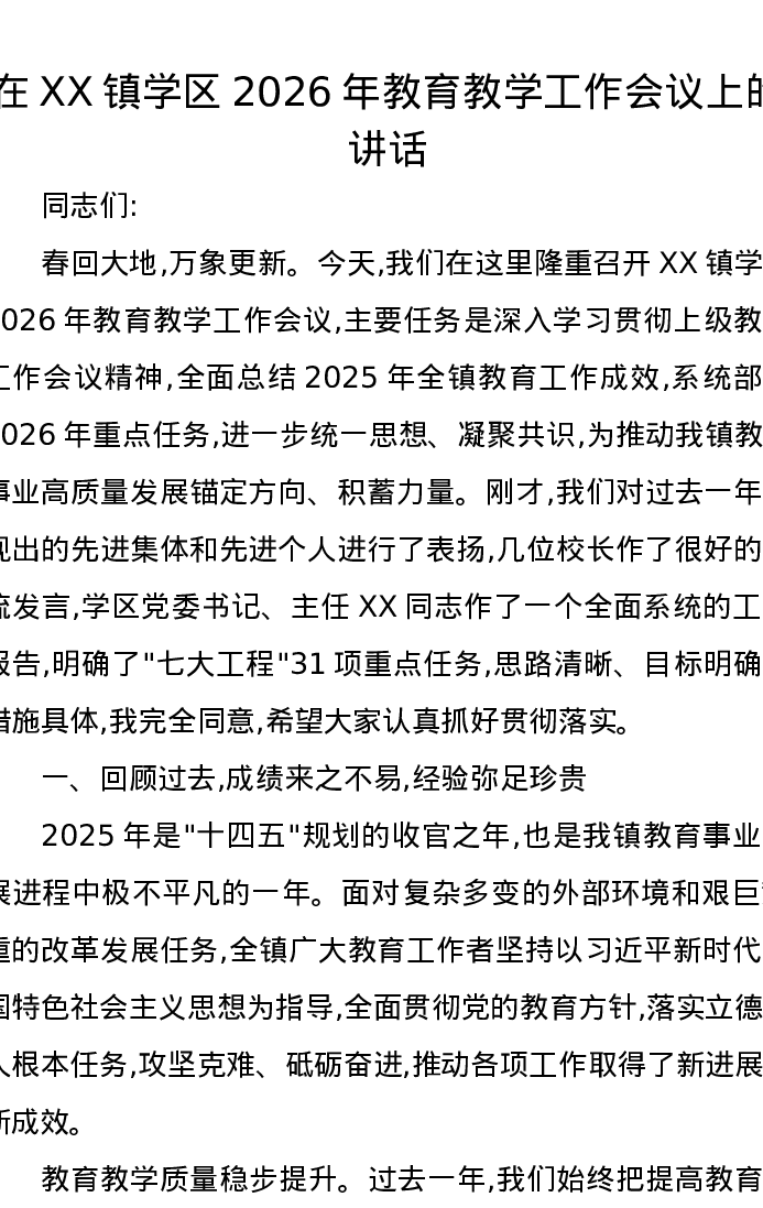 在XX镇学区2026年教育教学工作会议上的讲话