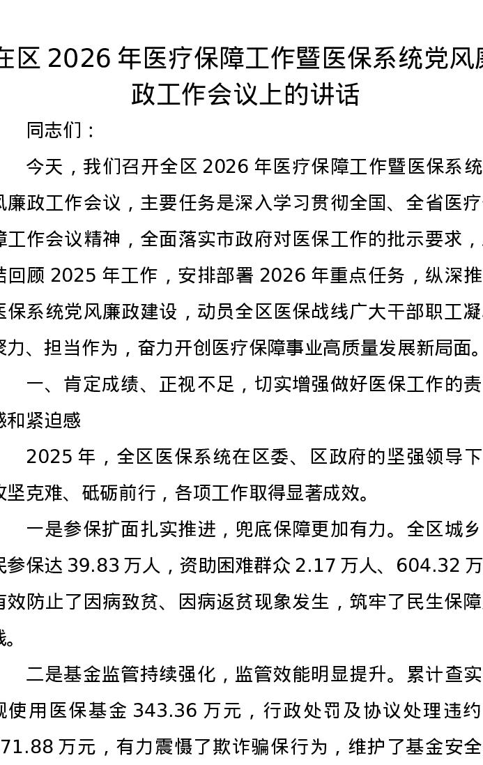在区2026年医疗保障工作暨医保系统党风廉政工作会议上的讲话