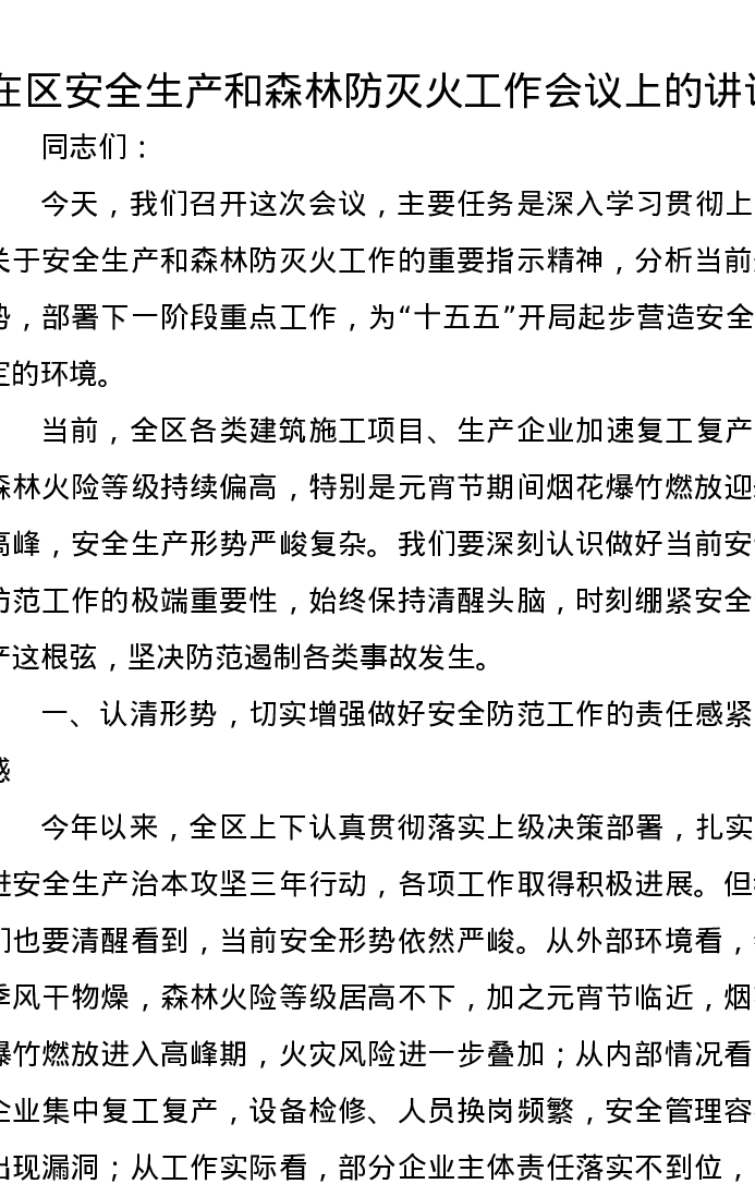 在区安全生产和森林防灭火工作会议上的讲话