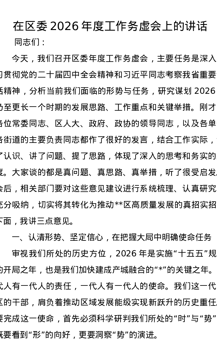 在区委2026年度工作务虚会上的讲话