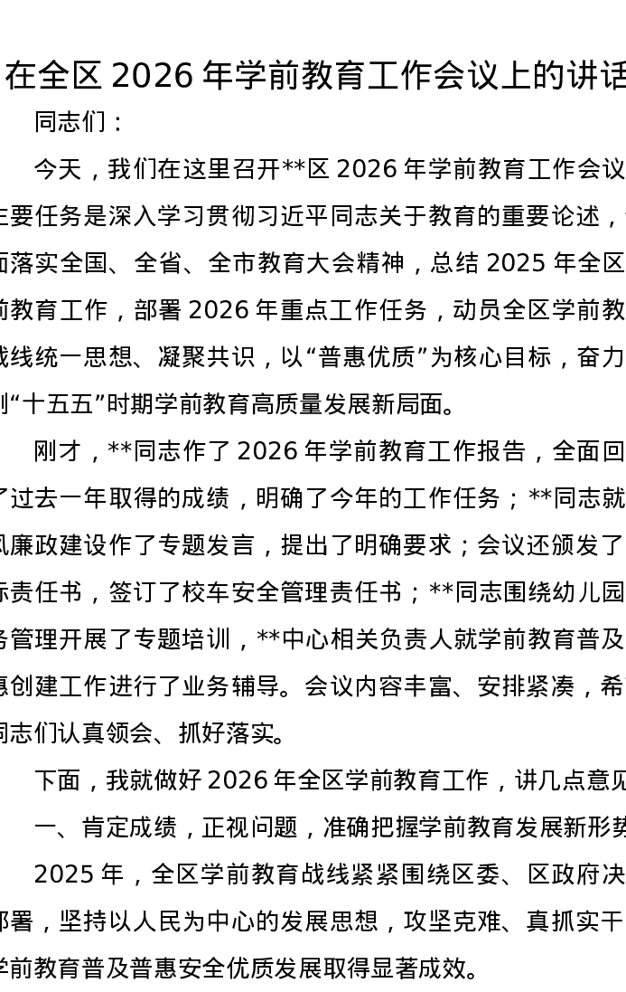 在全区2026年学前教育工作会议上的讲话