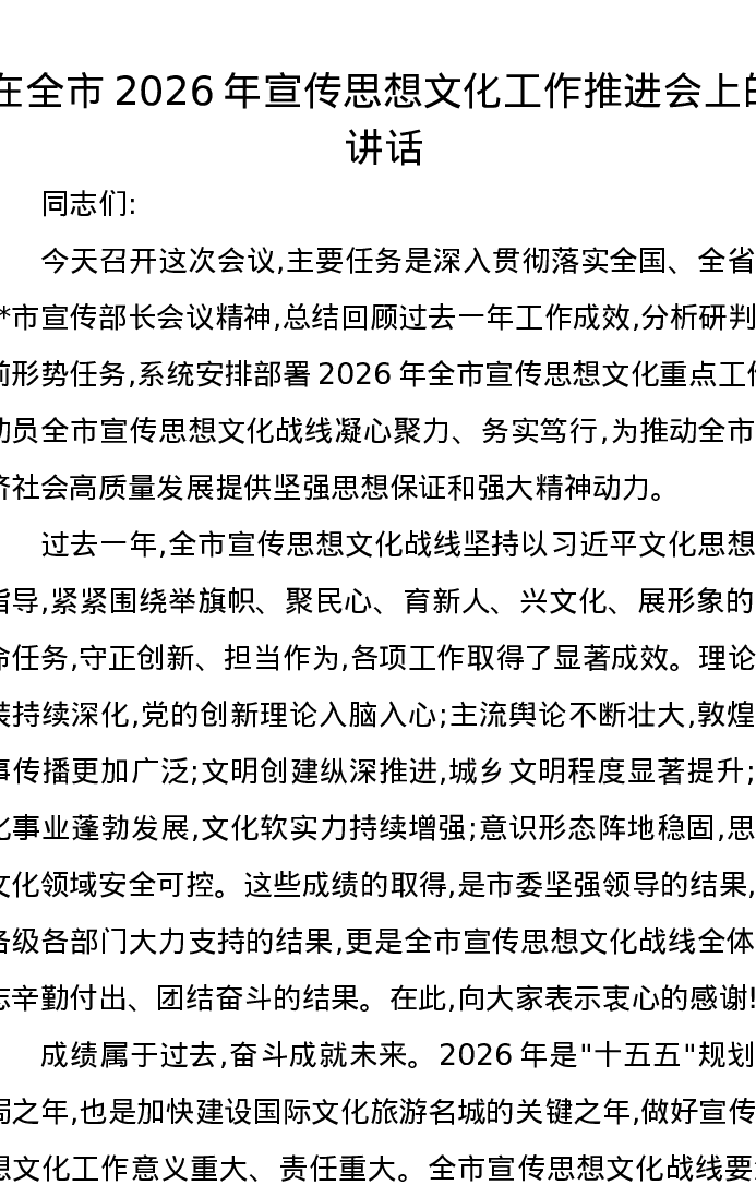 在全市2026年宣传思想文化工作推进会上的讲话