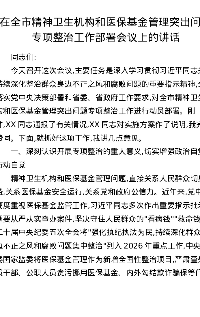 在全市精神卫生机构和医保基金管理突出问题专项整治工作部署会议上的讲话