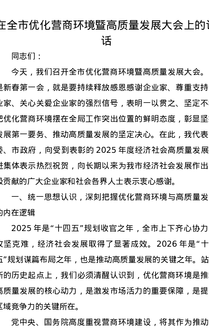 在全市优化营商环境暨高质量发展大会上的讲话