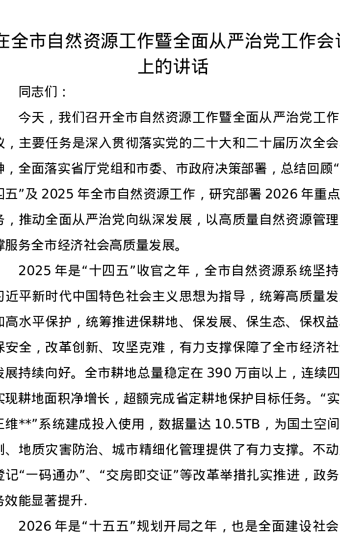 在全市自然资源工作暨全面从严治党工作会议上的讲话