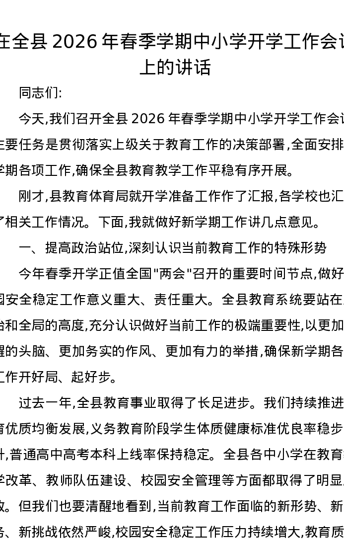 在全县2026年春季学期中小学开学工作会议上的讲话