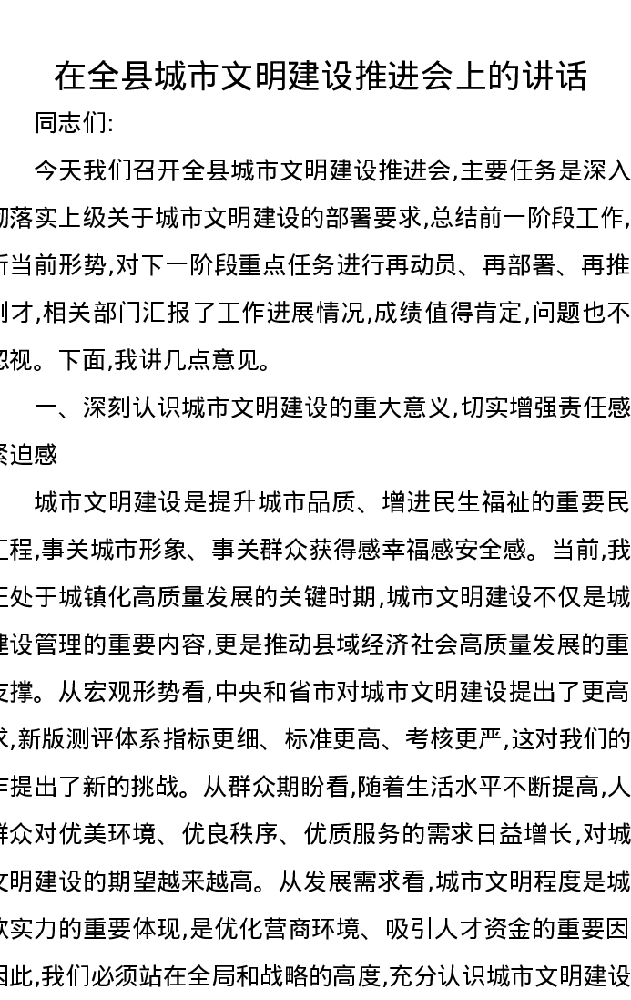 在全县城市文明建设推进会上的讲话