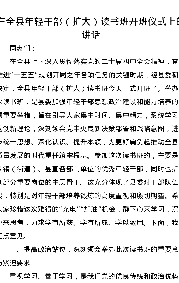 在全县年轻干部(扩大)读书班开班仪式上的讲话