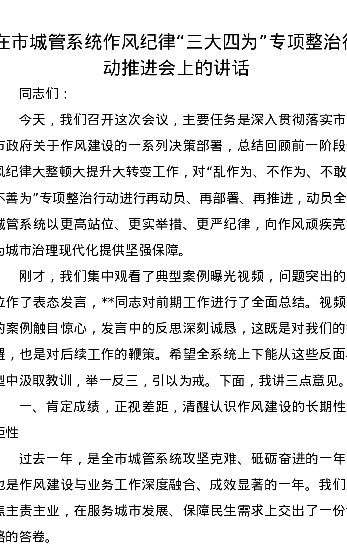 在市城管系统作风纪律三大四为专项整治行动推进会上的讲话
