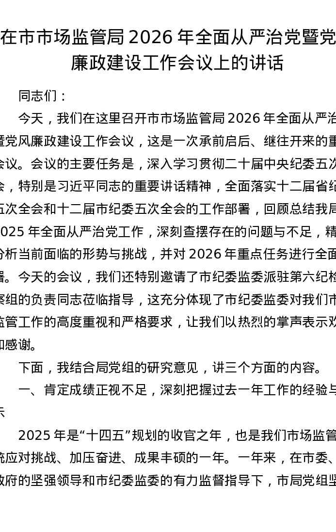 在市市场监管局2026年全面从严治党暨党风廉政建设工作会议上的讲话