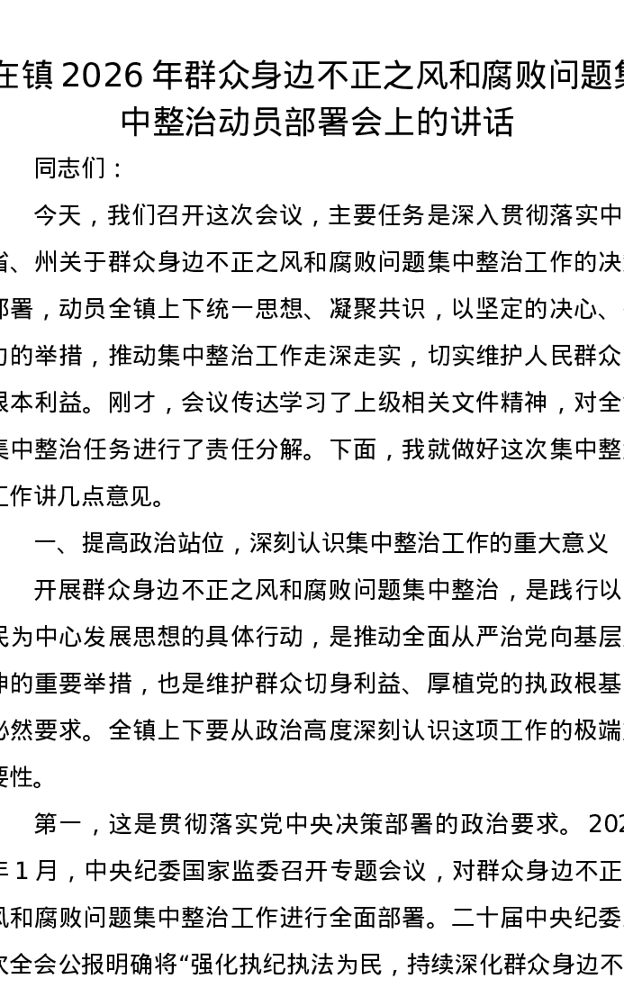 在镇2026年群众身边不正之风和腐败问题集中整治动员部署会上的讲话
