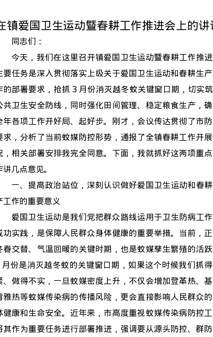在镇爱国卫生运动暨春耕工作推进会上的讲话