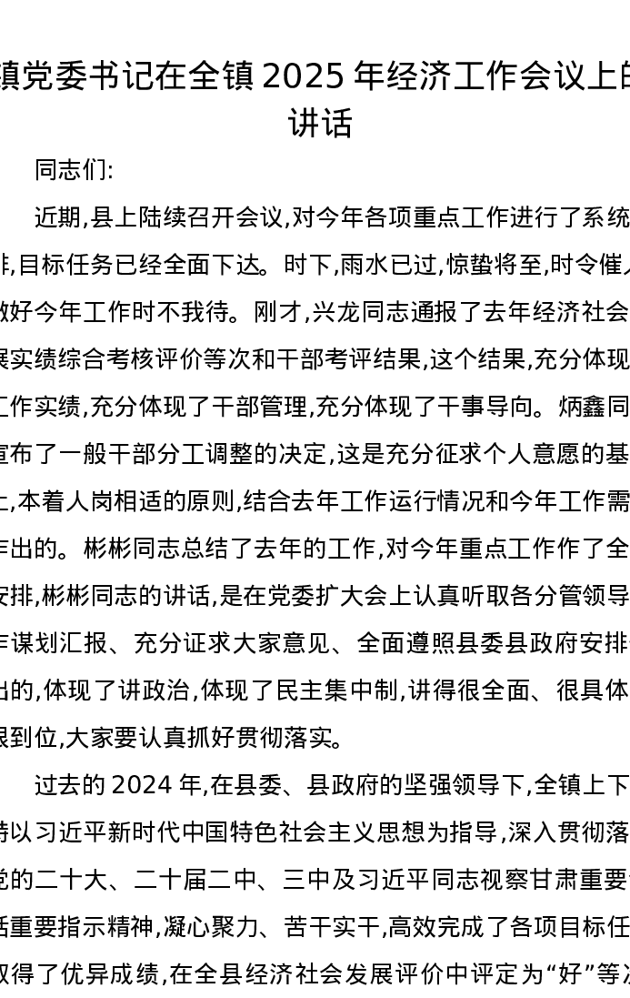 镇党委书记在全镇2025年经济工作会议上的讲话