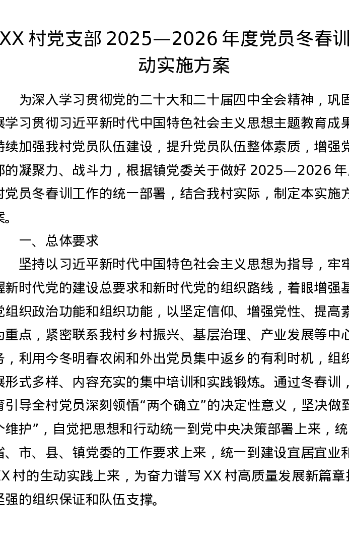 XX村党支部2025—2026年度党员冬春训活动实施方案