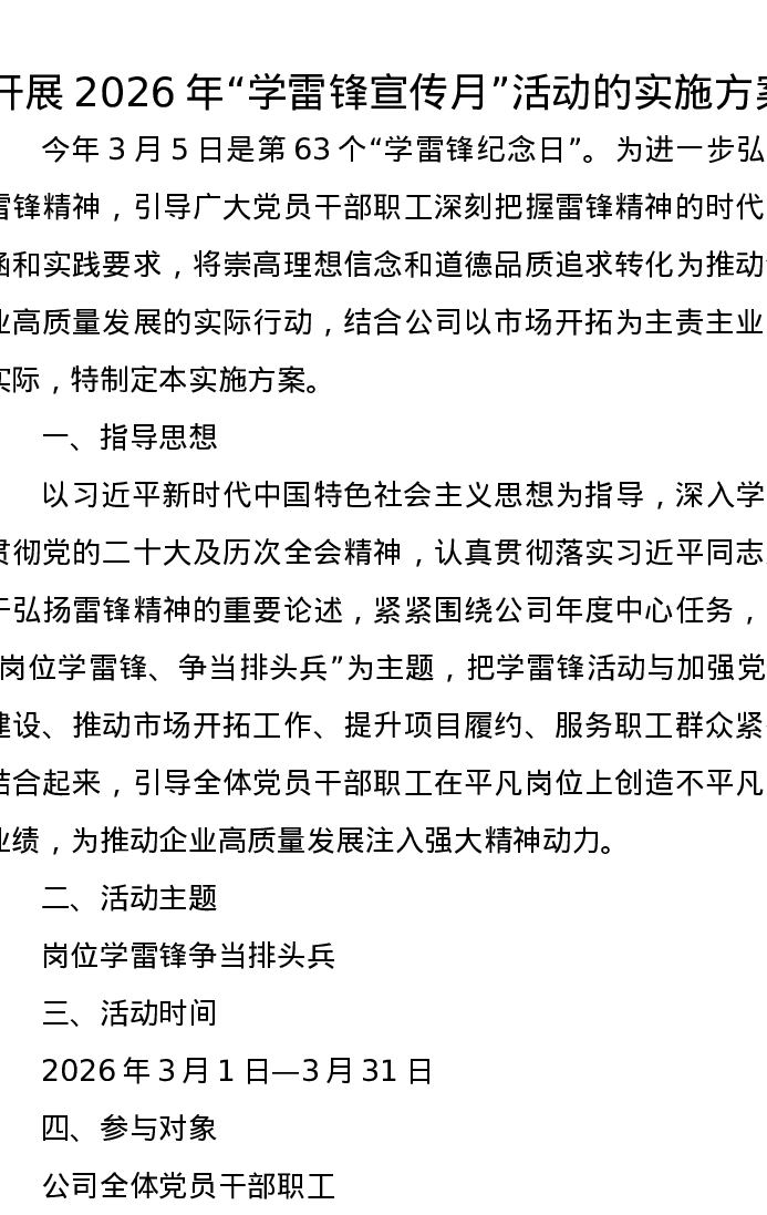 开展2026年学雷锋宣传月活动的实施方案