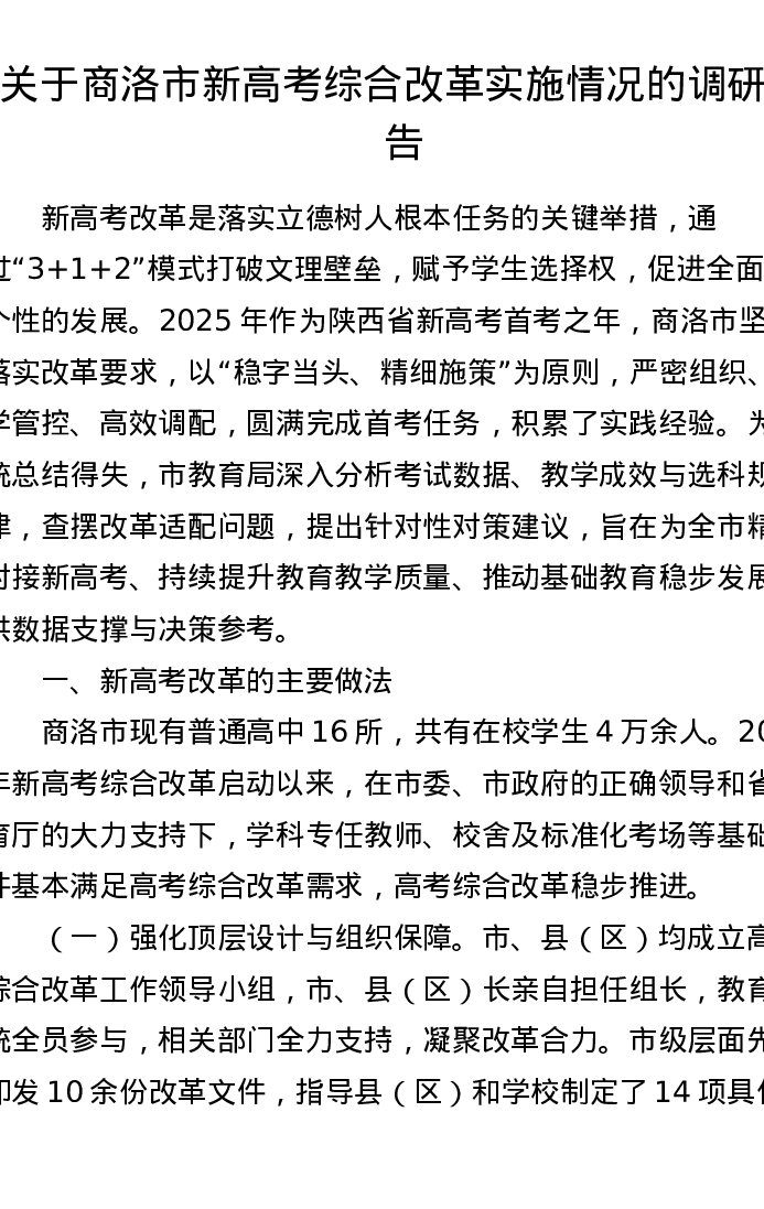 关于商洛市新高考综合改革实施情况的调研报告