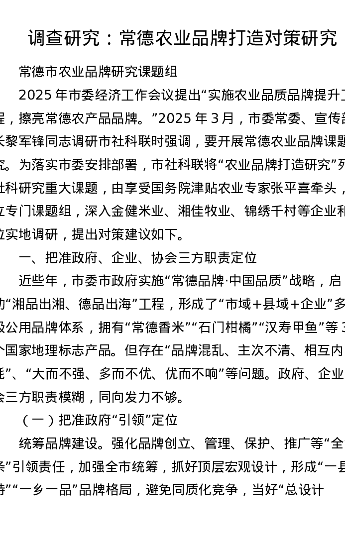 调研报告:常德农业品牌打造对策研究